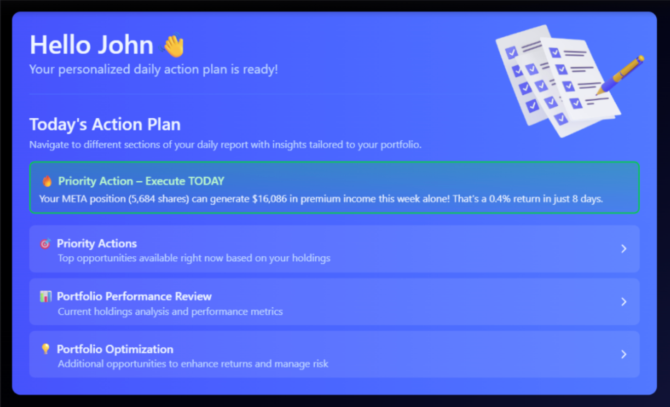 Every trading day begins with your personalized action plan - a summary of where your portfolio can generate the most income today. Each plan includes: