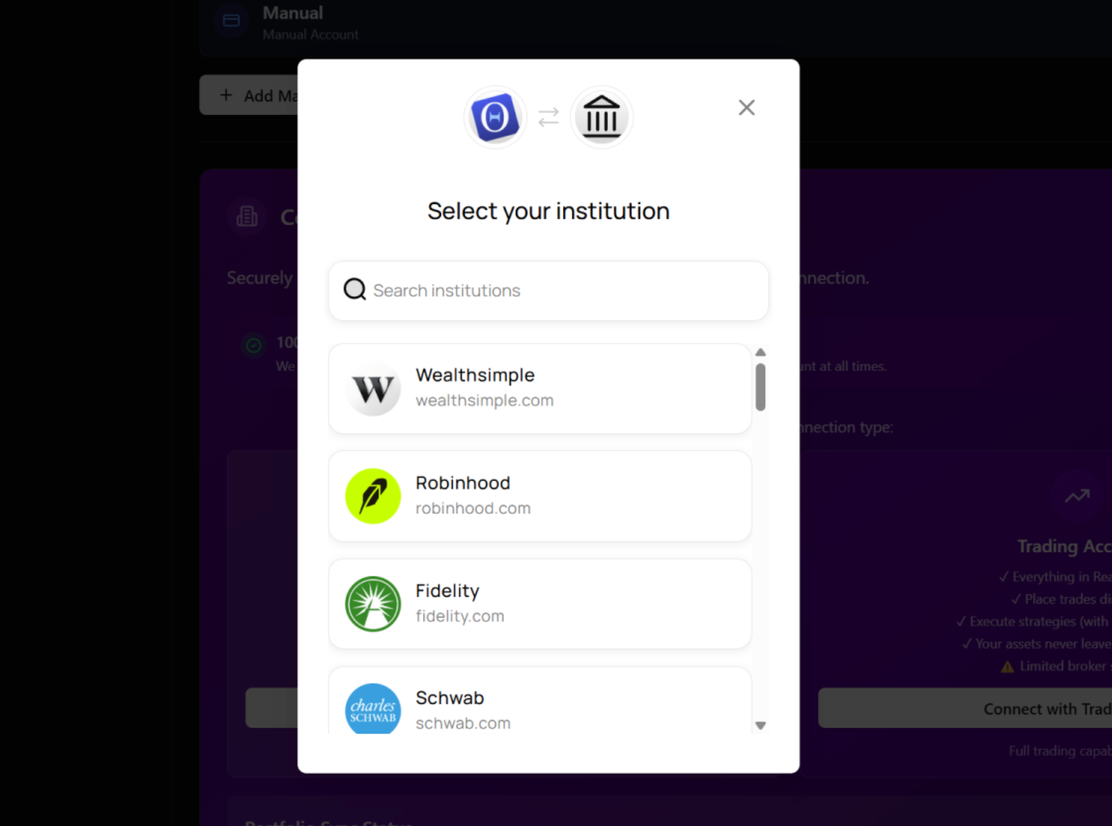 Connect your existing brokerages in minutes. ThetaEdge integrates with Robinhood, Fidelity, Schwab, Wealthsimple, and more - all through read-only connections for total security. No asset transfers, no custody risk, and no trade automation.