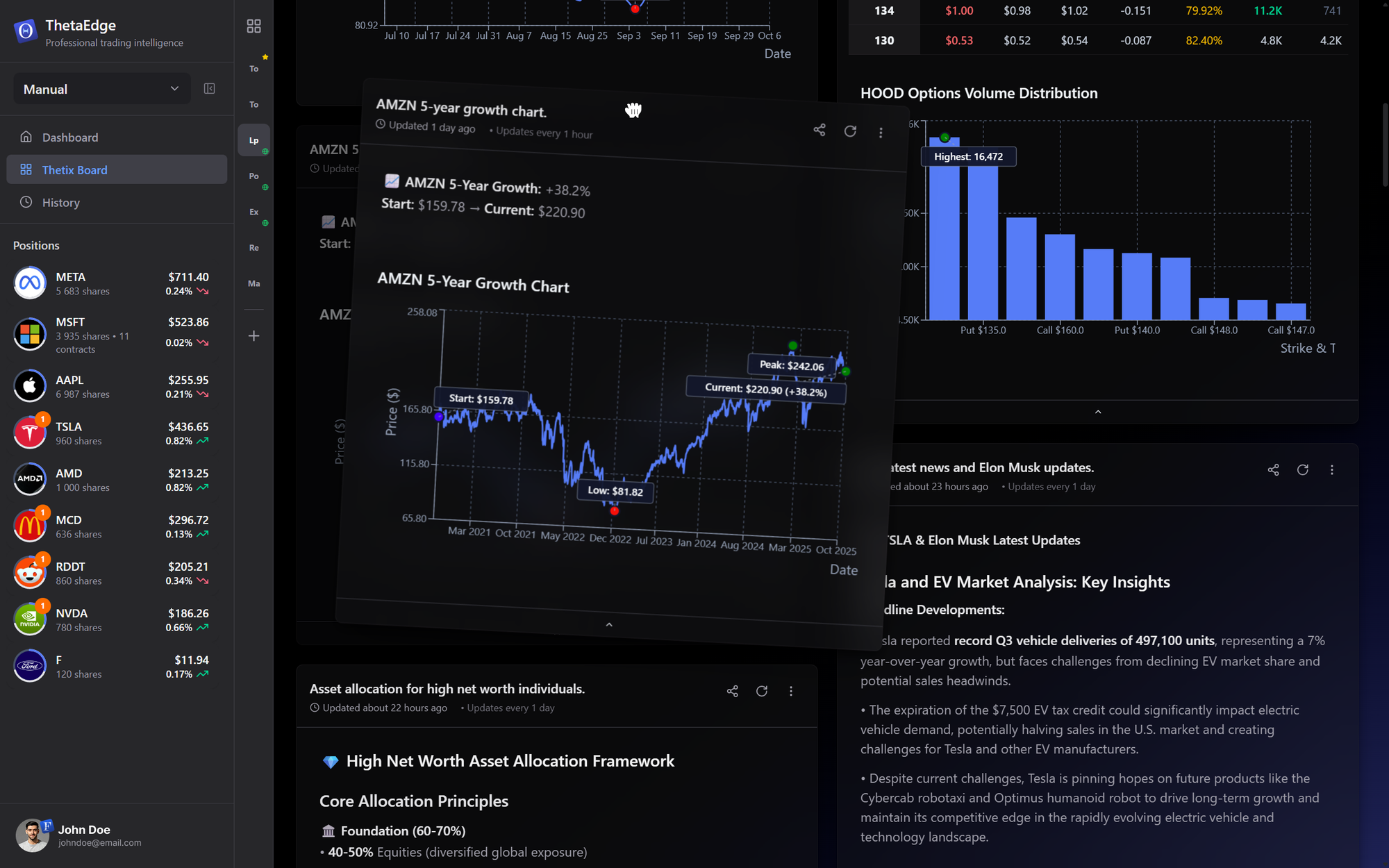 Fully customizable Thetix Board with live charts and market analysis.Compare NVDA vs. AMD across 90-day performance with automatic chart updates. Access sector insights, volume distributions, and asset allocation analysis.